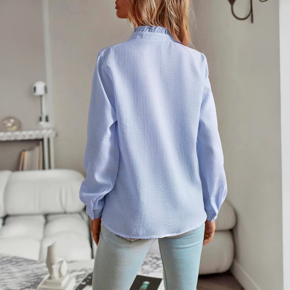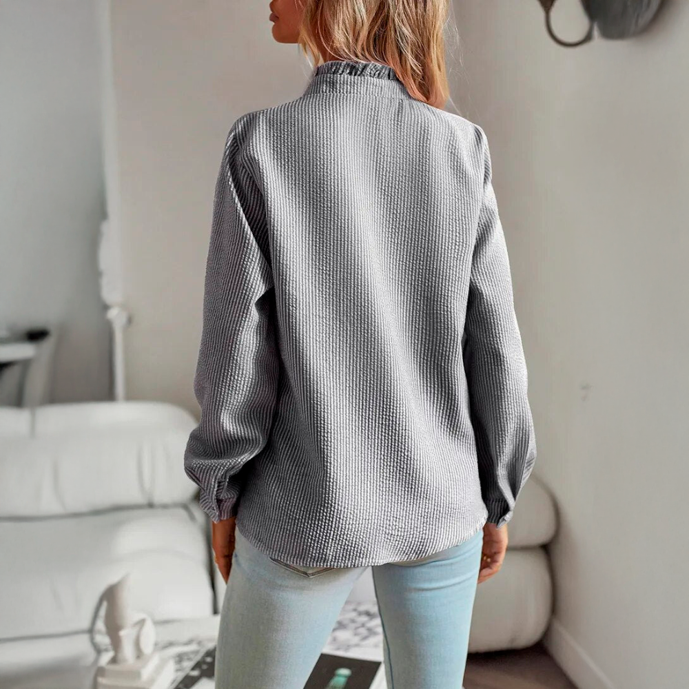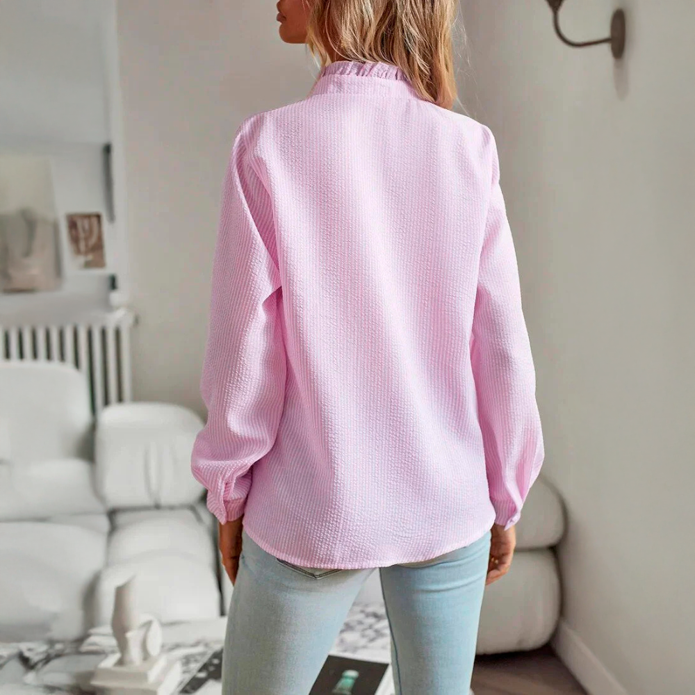 • Design elegante - O delicado pormenor do folho ao longo da linha dos botões confere um toque sofisticado e feminino, tornando-o adequado tanto para ocasiões casuais como formais.