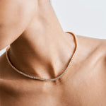 Dê um toque de luxo com a Gargantilha Rivière, banhado a ouro de 14k. Esta peça requintada apresenta uma linha contínua de pedras brilhantes, criando um efeito deslumbrante e elegante. Perfeito para qualquer ocasião, oferece um toque clássico e glamoroso para elevar o seu estilo.