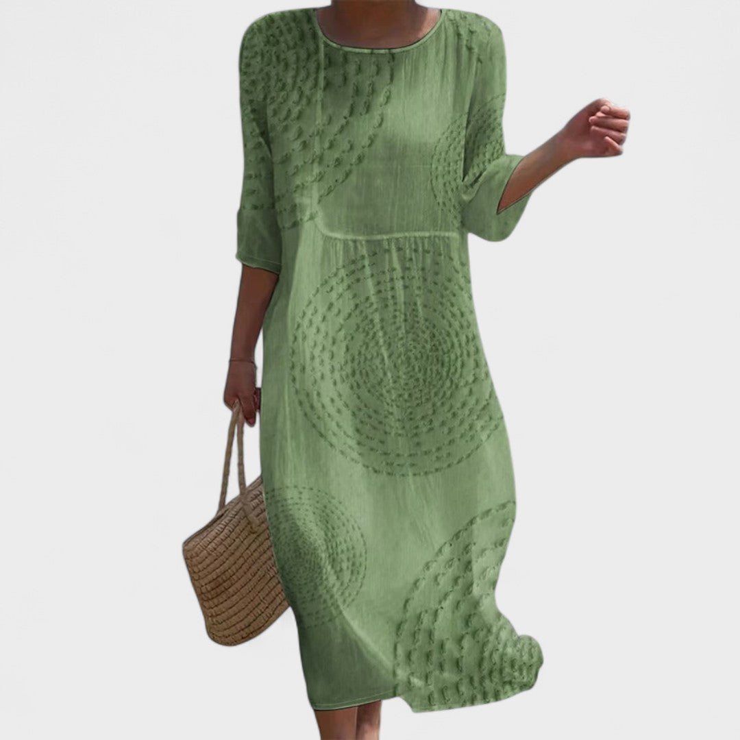 Imagine-se a caminhar pela praia, sentindo a brisa do mar, enquanto veste um vestido que traduz frescura, conforto e estilo. Este vestido azul-claro com padrão em relevo é a escolha perfeita para quem procura um look descontraído, elegante e cheio de leveza. Com o seu corte fluído, manga 3/4 e tecido respirável, é ideal para dias quentes, passeios à beira-mar ou encontros casuais.
