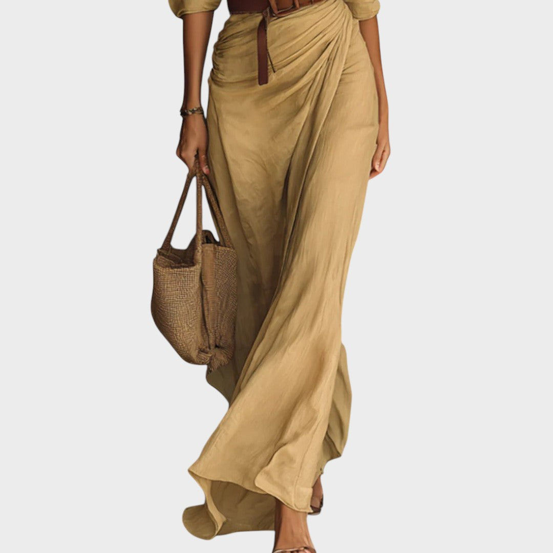 Este elegante vestido comprido destaca-se pelo cinto que realça a cintura, criando uma silhueta feminina e sofisticada. As mangas compridas com punhos dão-lhe um toque clássico e refinado, enquanto o corte fluido garante conforto e liberdade de movimento durante todo o dia. Perfeito para um look chique e elegante em qualquer estação.