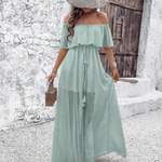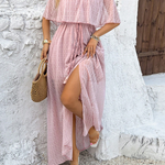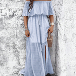 Eleve o seu guarda-roupa para os dias quentes com este vestido maxi com ombros à mostra, concebido para oferecer um equilíbrio entre elegância e charme ousado. O padrão intemporal de bolinhas e a fenda alta lisonjeira tornam-no numa peça de destaque para festas de verão, eventos noturnos ou encontros elegantes durante o dia.