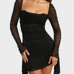 Este vestido mini preto com pedraria é feito para quem quer destacar-se com elegância e confiança. O decote drapeado confere um toque sensual e sofisticado, enquanto as mangas em tule com brilho adicionam leveza e glamour. O detalhe assimétrico na saia cria movimento e ousadia, tornando-o a escolha ideal para festas, saídas à noite ou eventos especiais. Mais do que uma peça de roupa, é uma expressão de atitude.