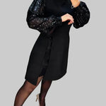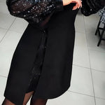 Este vestido combina elegância minimalista com um toque de brilho noturno. Seu tecido liso e impecavelmente ajustado valoriza a silhueta, enquanto as mangas bufantes e brilhantes adicionam personalidade e fazem você se destacar a cada passo — seja em uma reunião de família, jantar, encontro romântico ou outra ocasião festiva.