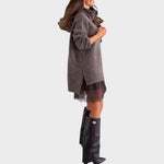 Este conjunto é composto por uma blusa de gola alta oversized, macia, quente e com modelagem solta, ideal para um estilo casual. Complementa a peça um vestido slip leve e delicado com uma camada de tule de renda na barra, que adiciona movimento, charme e um toque sutil de sensualidade que transforma o look.