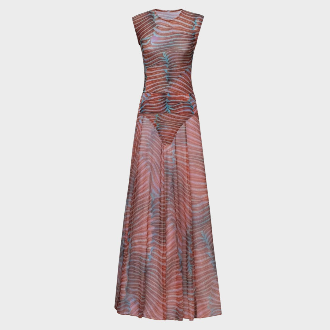 Este conjunto com padrão ondulado em tons quentes é a definição de sofisticação descontraída. O tecido leve cria um movimento fluído a cada passo, enquanto o design sem mangas e o corte elegante abraçam a silhueta de forma natural. Perfeito para jantares ao ar livre, festas na praia ou ocasiões especiais onde deseja brilhar com um toque artístico e moderno.